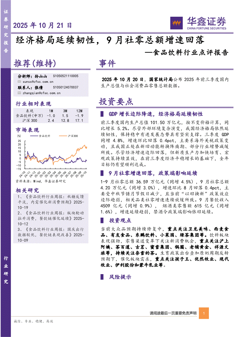 食品饮料行业:华鑫证券-食品饮料行业点评报告:经济格局延续韧性,9月社零总额增速回落-251021