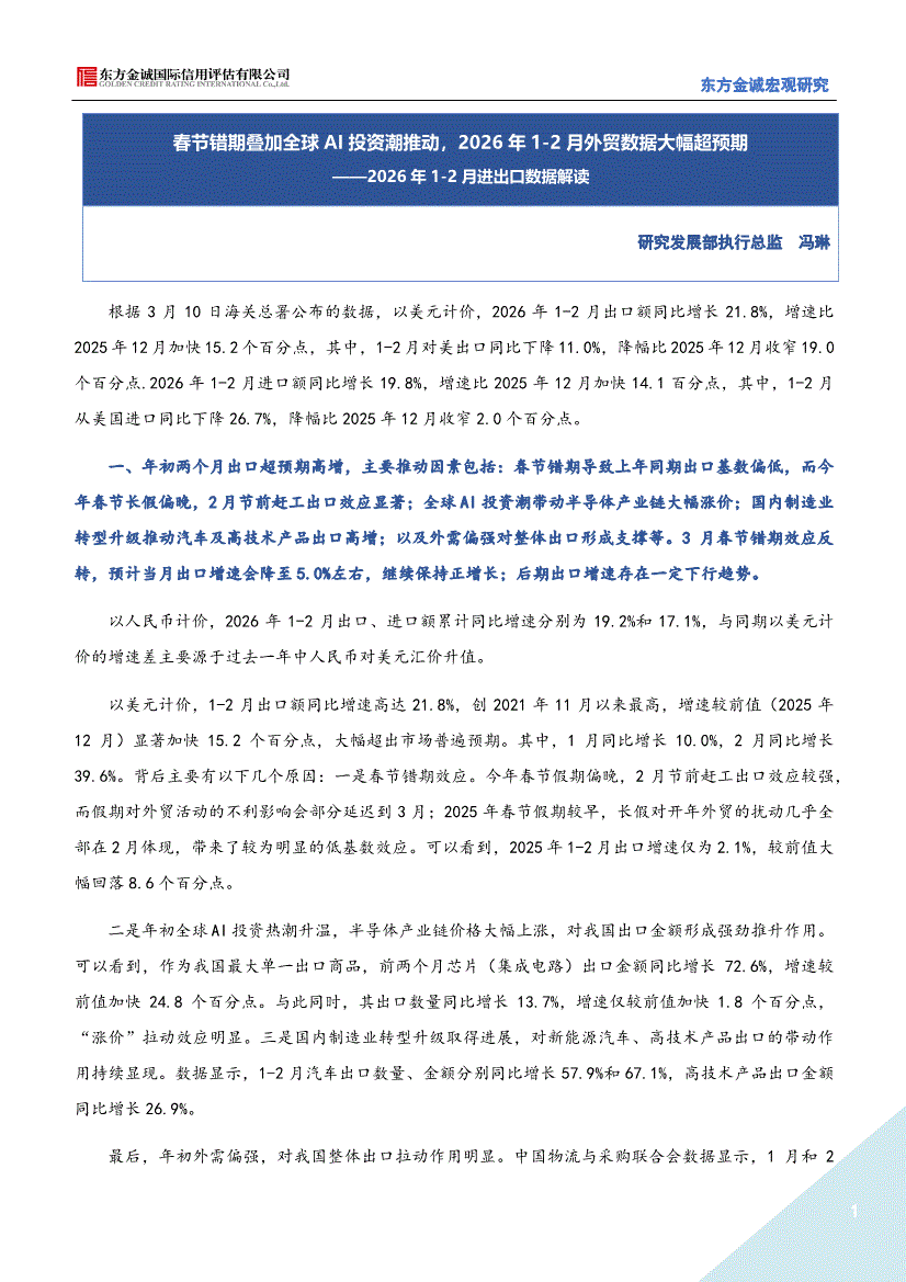 东方金诚-2026年1~2月进出口数据解读:春节错期叠加全球AI投资潮推动,2026年1~2月外贸数据大幅超预期-260310
