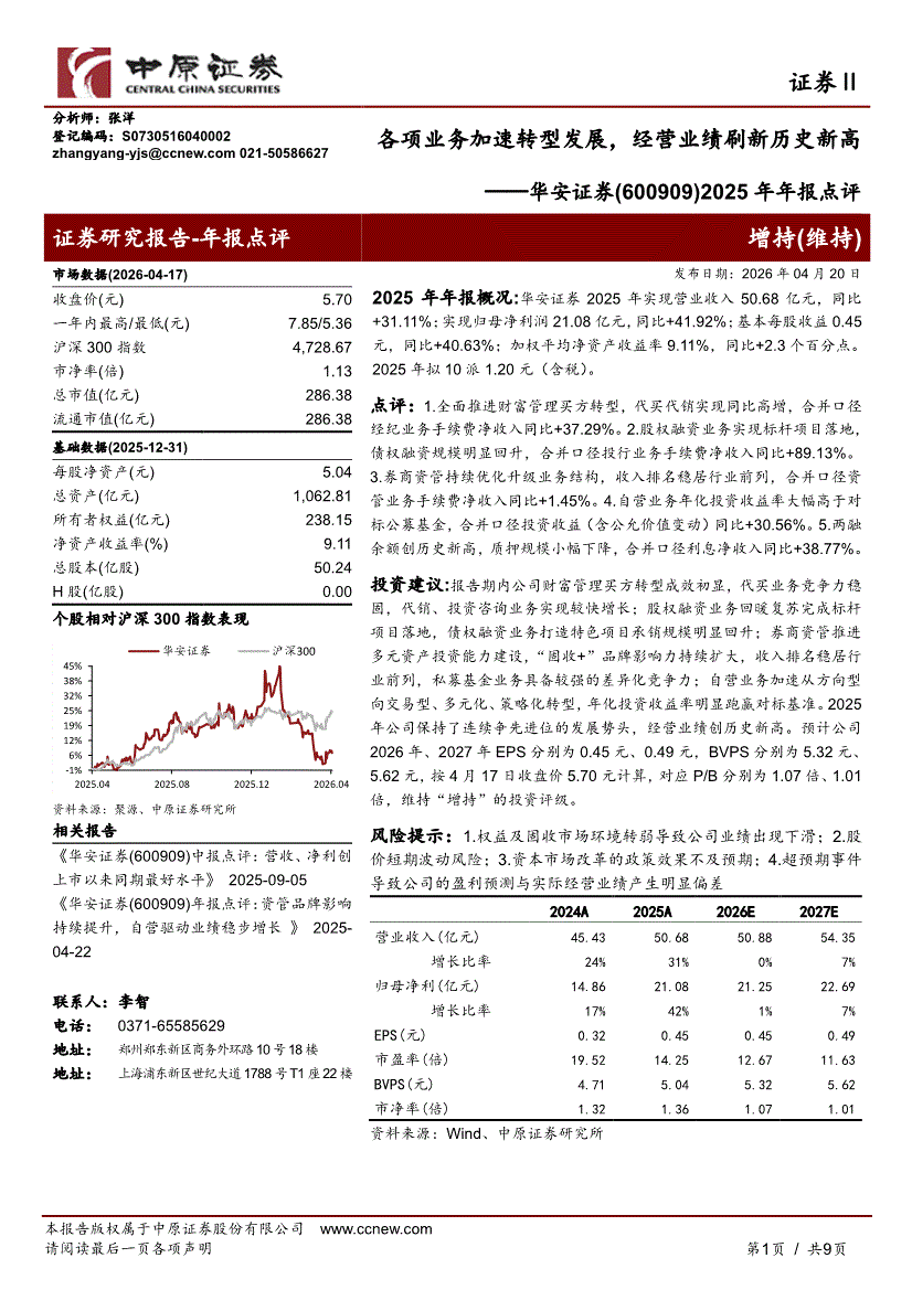 华安证券:中原证券-华安证券-600909-2025年年报点评:各项业务加速转型发展,经营业绩刷新历史新高-260420