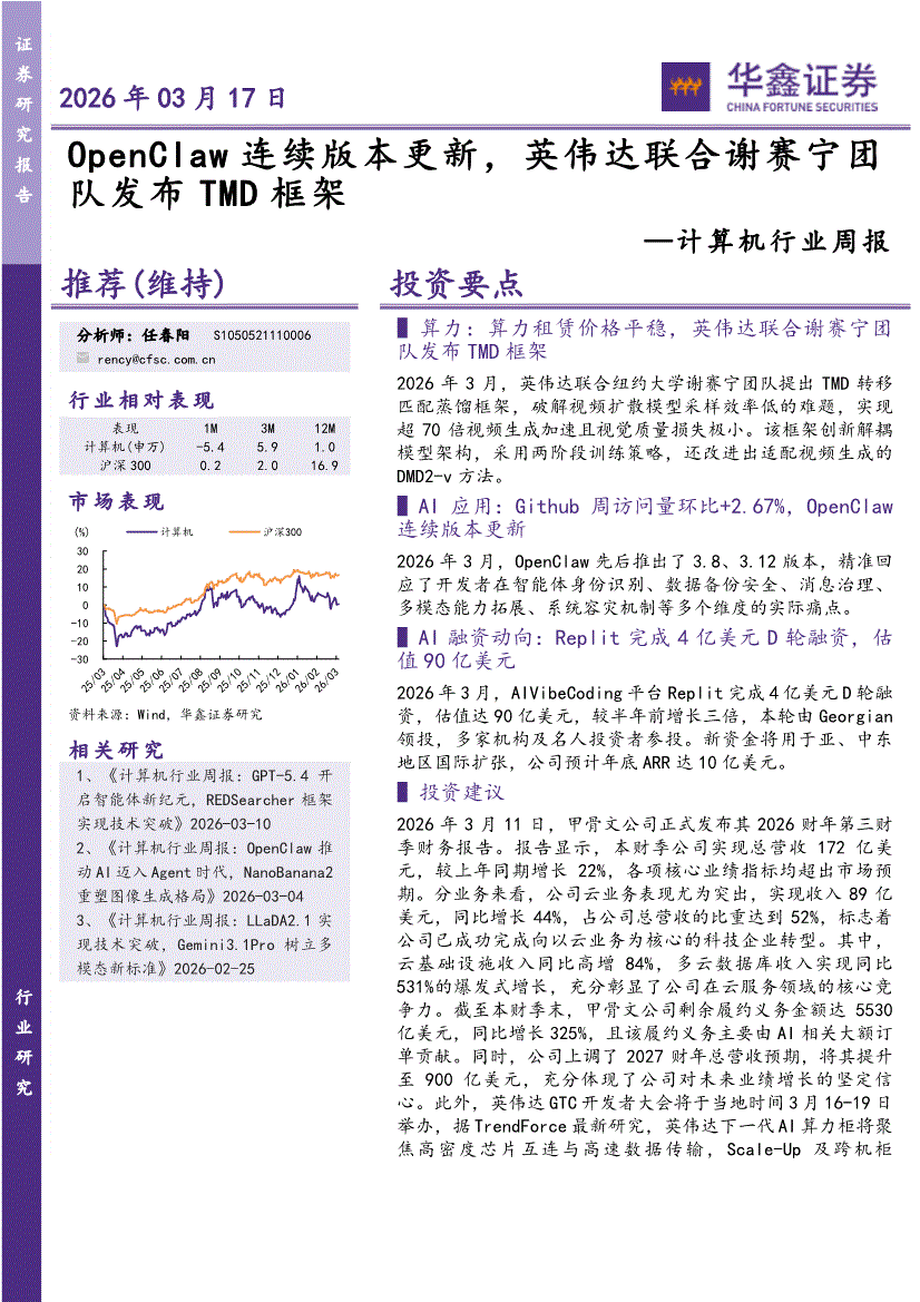 计算机行业:华鑫证券-计算机行业周报:OpenClaw连续版本更新,英伟达联合谢赛宁团队发布TMD框架-260317
