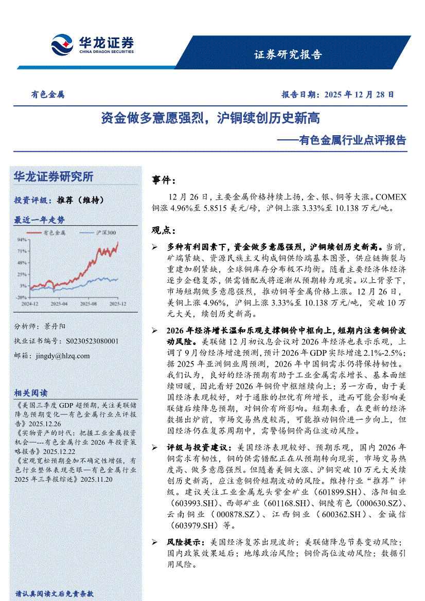 有色金属行业:华龙证券-有色金属行业点评报告:资金做多意愿强烈,沪铜续创历史新高-251228