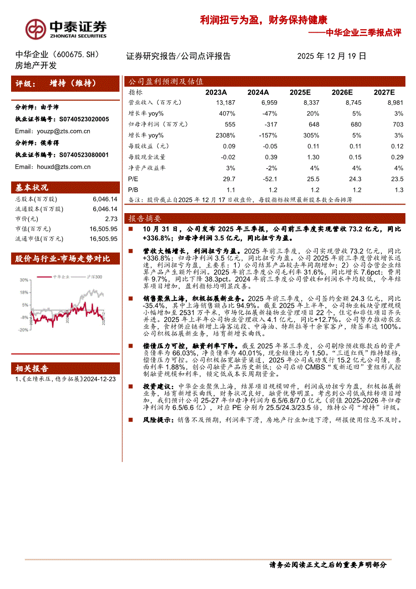 中华企业:中泰证券-中华企业-600675-三季报点评:利润扭亏为盈,财务保持健康-251219