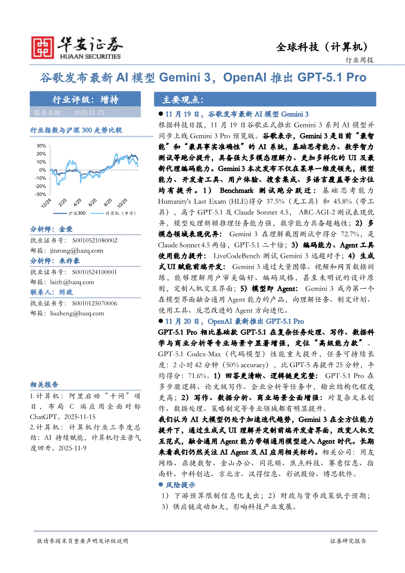 计算机行业:华安证券-计算机行业周报:谷歌发布最新AI模型Gemini 3,OpenAI推出GPT~5.1 Pro-251123