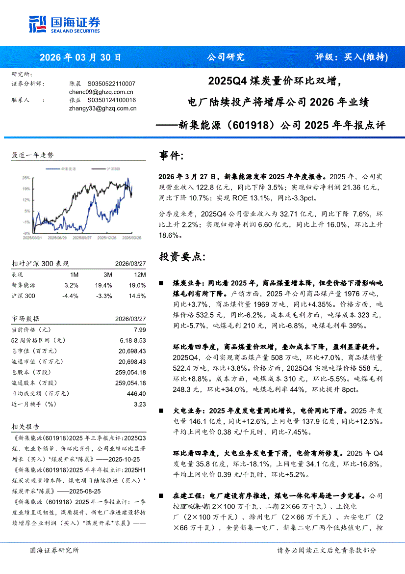新集能源:国海证券-新集能源-601918-公司2025年年报点评:2025Q4煤炭量价环比双增,电厂陆续投产将增厚公司2026年业绩-260330