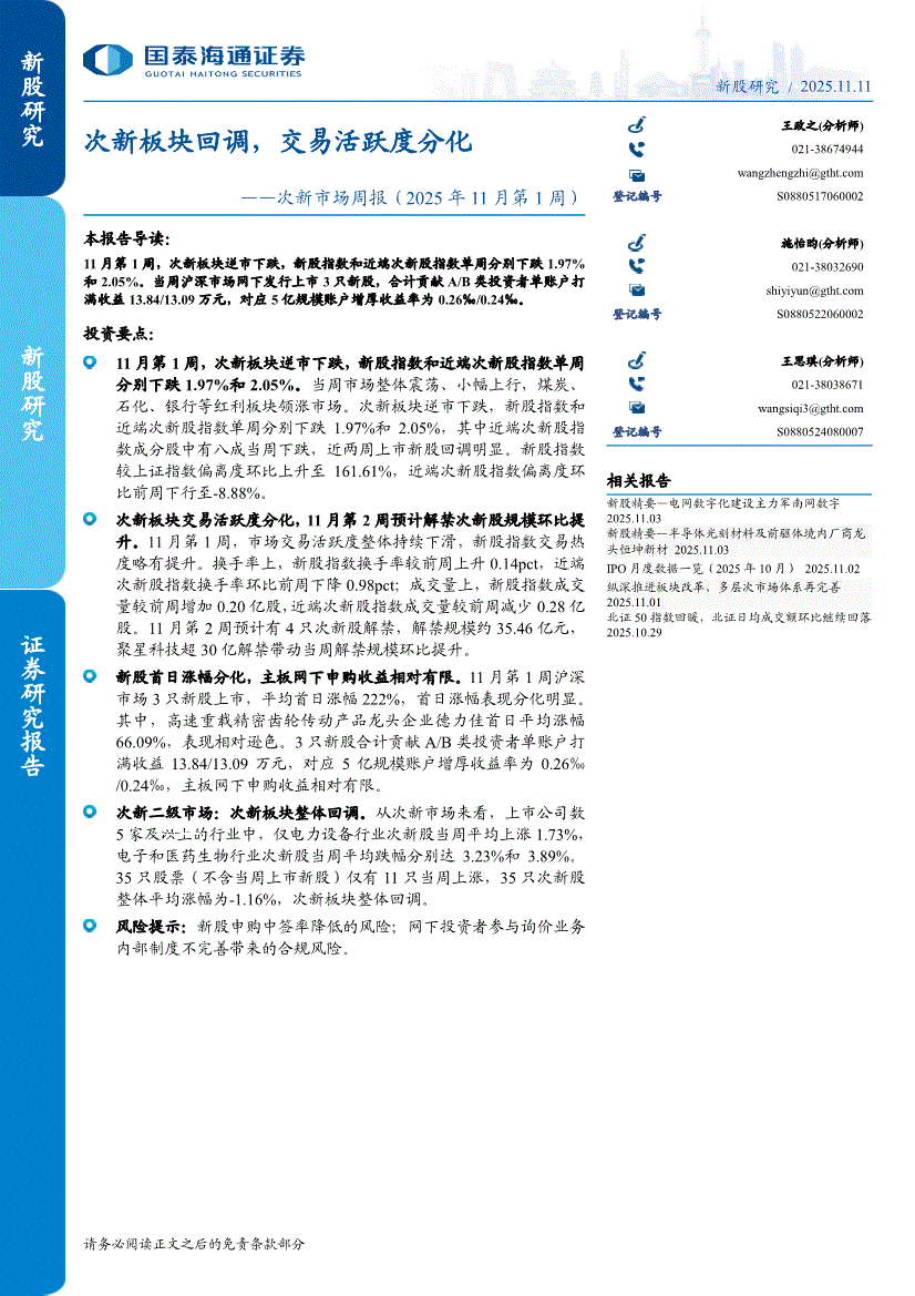 国泰海通证券-次新市场周报(2025年11月第1周):次新板块回调,交易活跃度分化-251111
