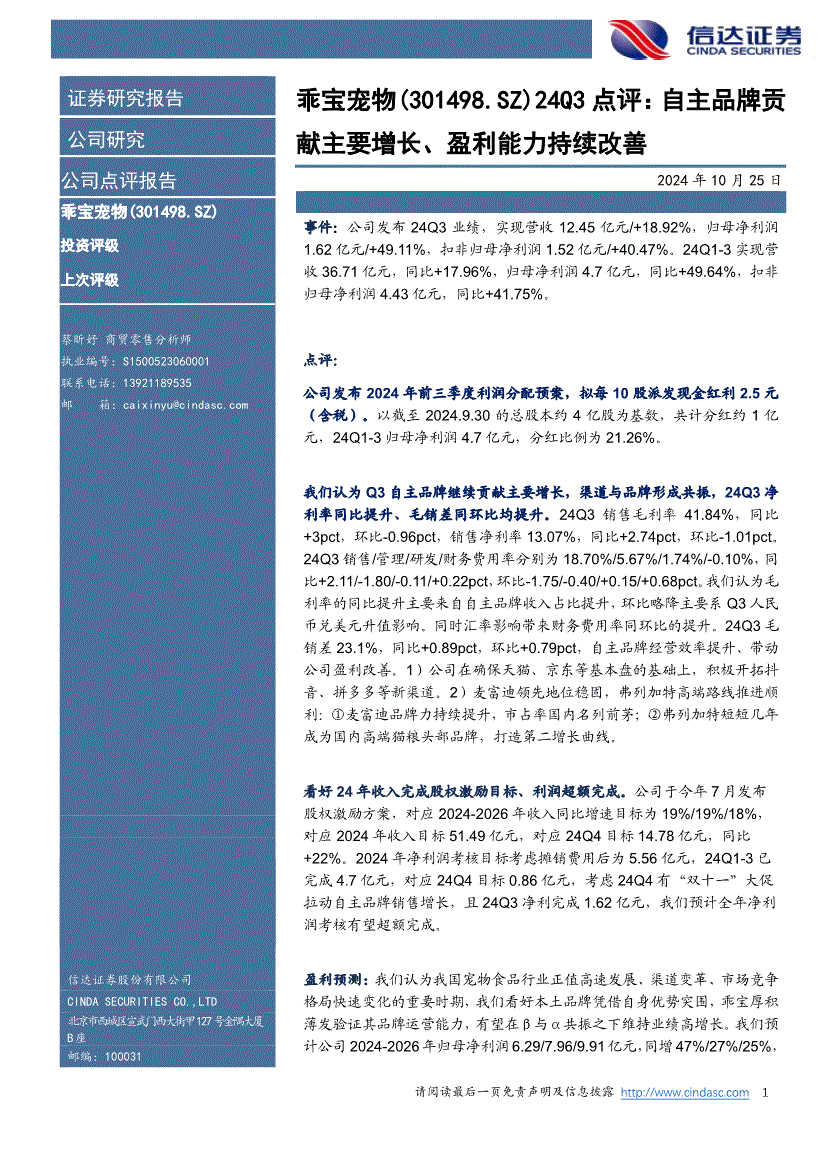 乖宝宠物:信达证券-乖宝宠物-301498-24Q3点评:自主品牌贡献主要增长、盈利能力持续改善-241025