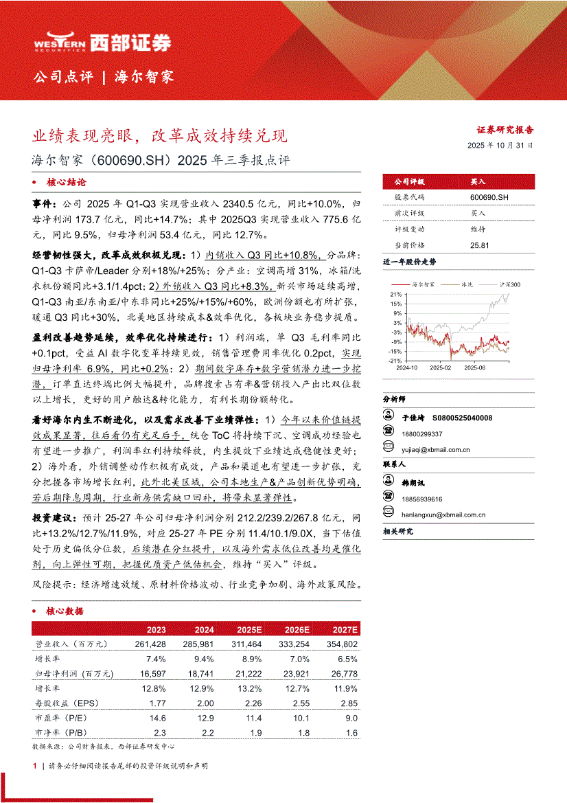 海尔智家:西部证券-海尔智家-600690-2025年三季报点评:业绩表现亮眼,改革成效持续兑现-251031