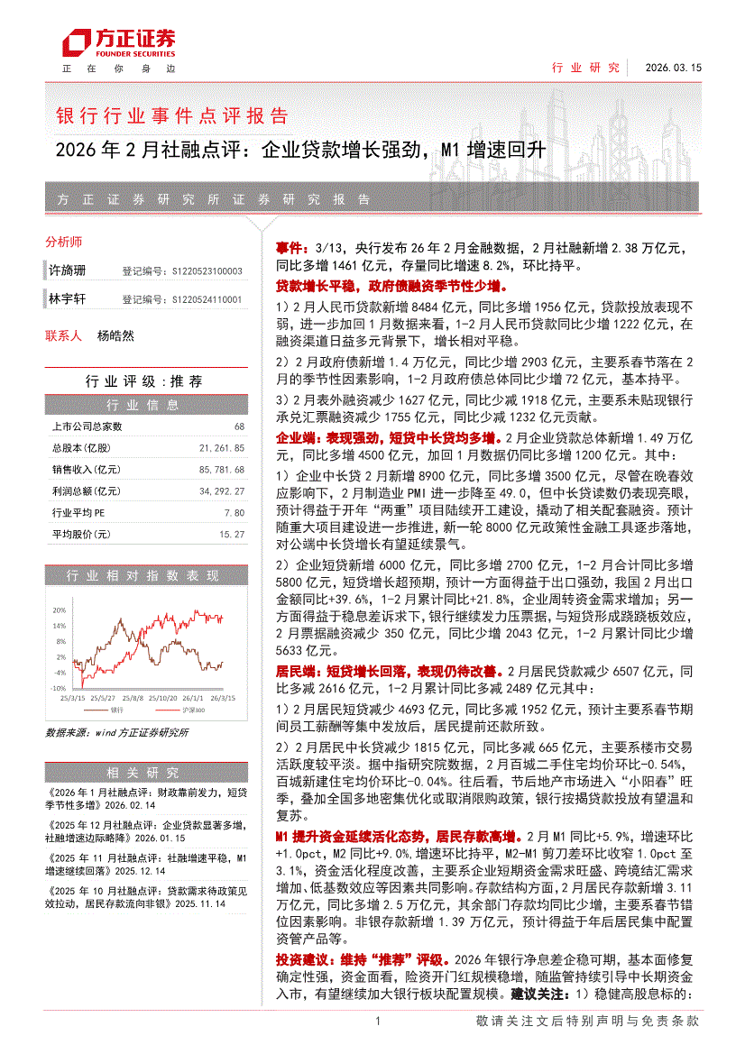 银行业:方正证券-银行行业事件点评报告:2026年2月社融点评,企业贷款增长强劲,M1增速回升-260315