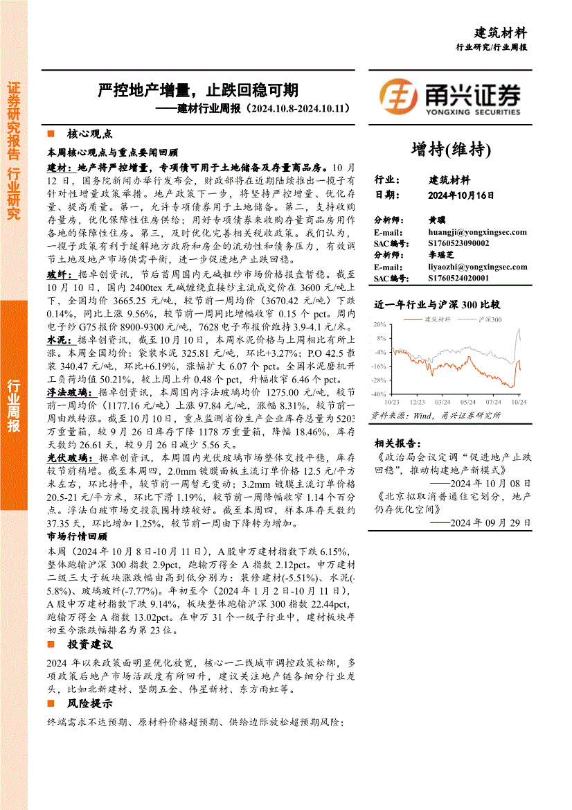 建材行业:甬兴证券-建材行业周报:严控地产增量,止跌回稳可期-241016