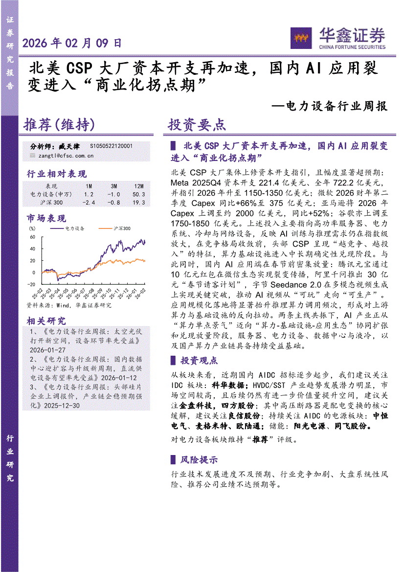 电力设备行业:华鑫证券-电力设备行业周报:北美CSP大厂资本开支再加速,国内AI应用裂变进入“商业化拐点期”-260209