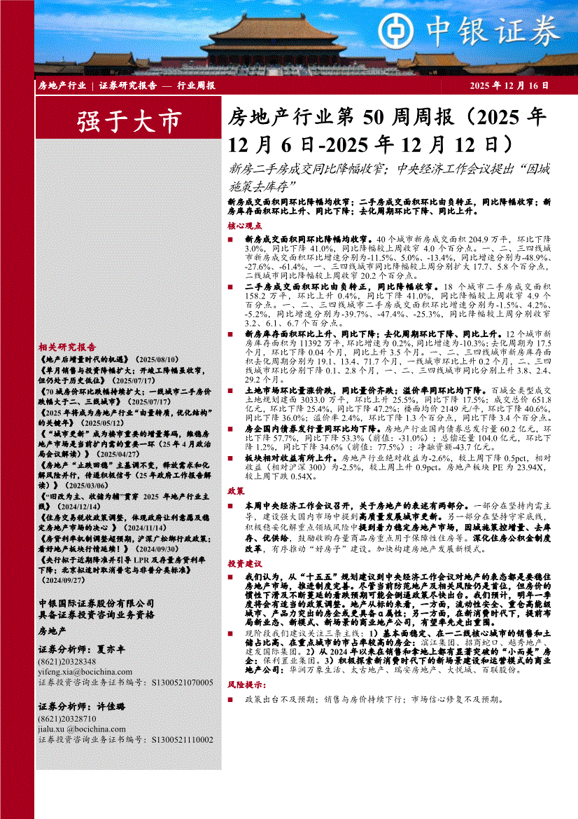 房地产行业:中银国际-房地产行业第50周周报(2025年12月6日~2025年12月12日):新房二手房成交同比降幅收窄;中央经济工作会议提出“因城施策去库存”-251216