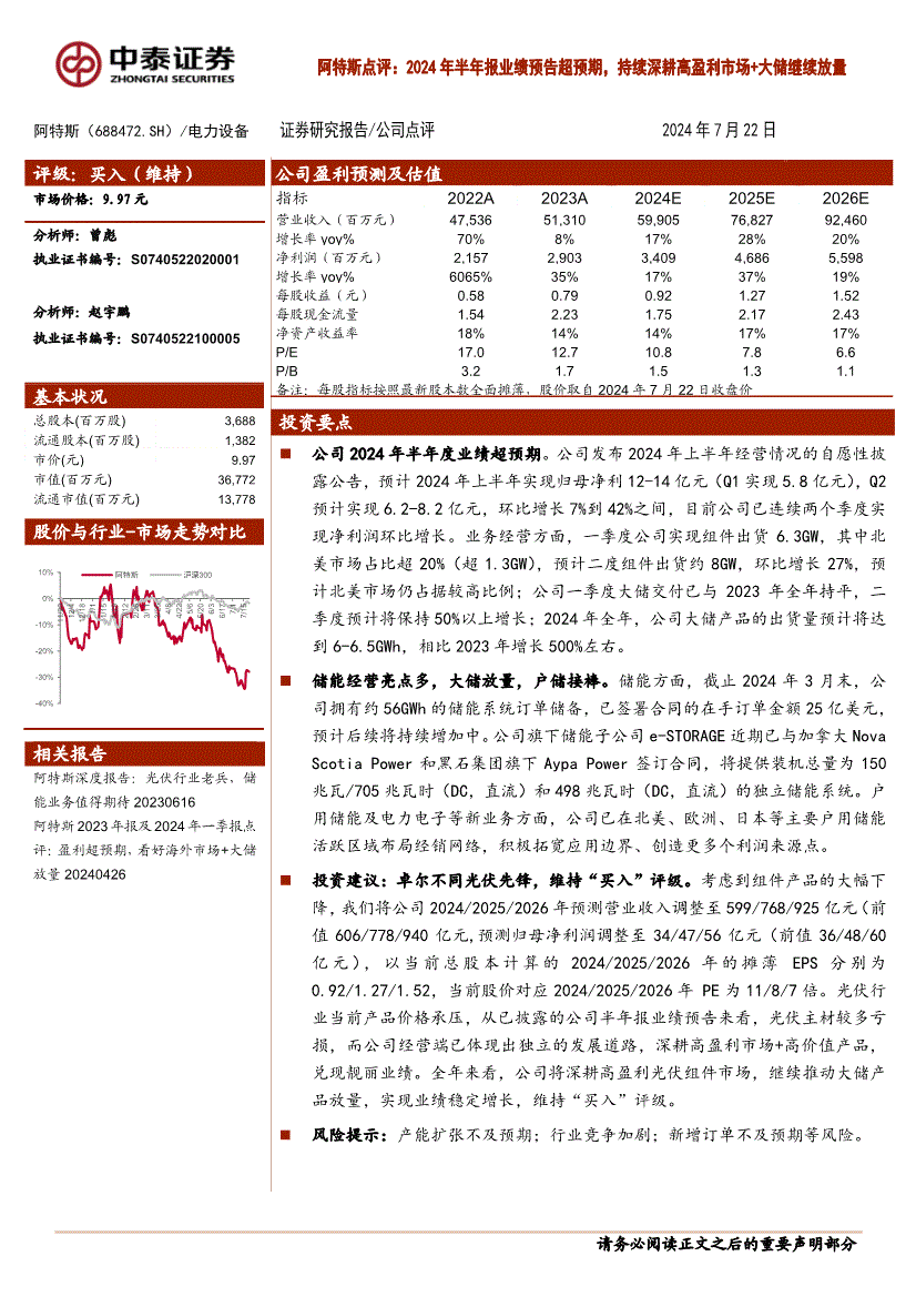 阿特斯:中泰证券-阿特斯-688472-2024年半年报业绩预告超预期,持续深耕高盈利市场+大储继续放量-240722
