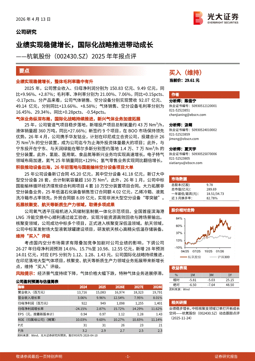 杭氧股份:光大证券-杭氧股份-002430-2025年年报点评:业绩实现稳健增长,国际化战略推进带动成长-260413