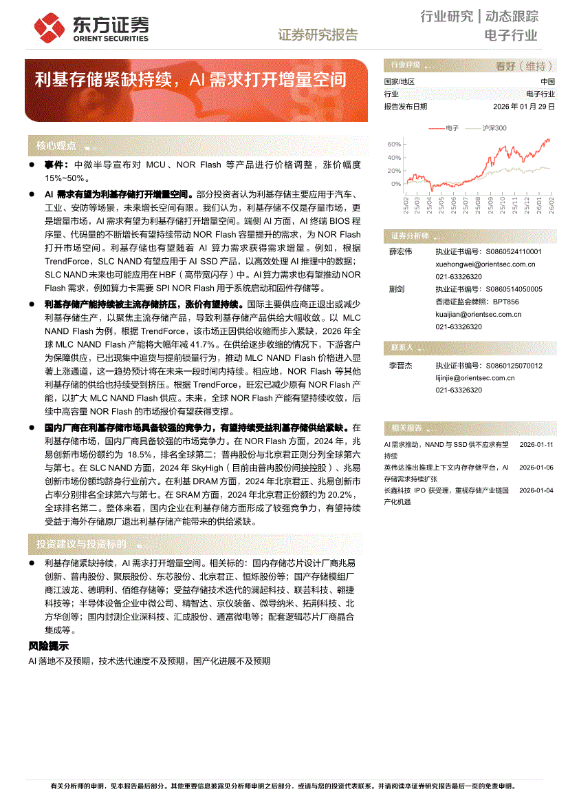 电子行业:东方证券-电子行业动态跟踪:利基存储紧缺持续,AI需求打开增量空间-260129