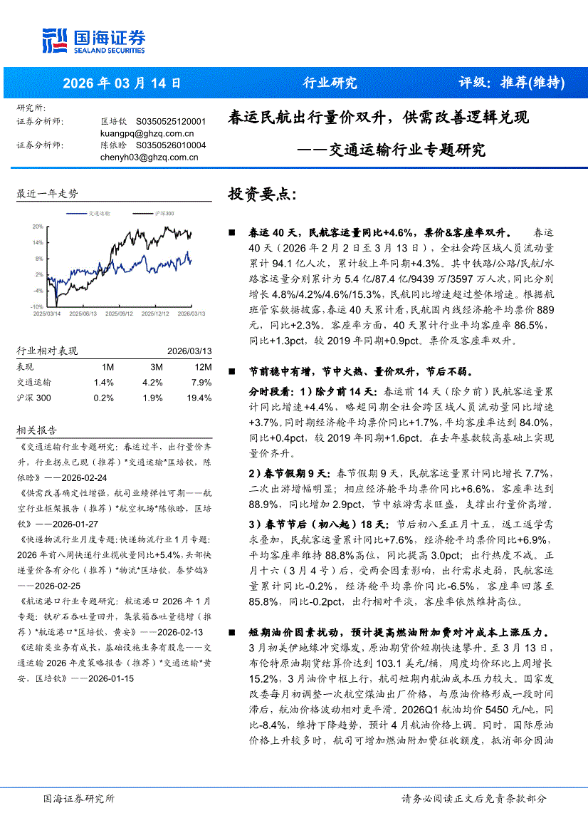 交通运输行业:国海证券-交通运输行业专题研究:春运民航出行量价双升,供需改善逻辑兑现-260314