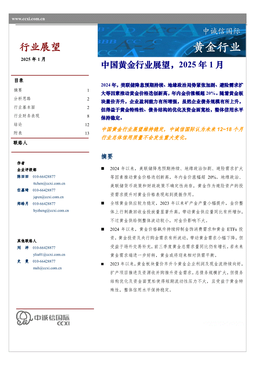 黄金行业:中诚信国际-黄金行业:中国黄金行业展望,2025年1月-250124