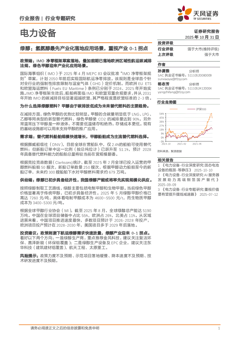电力设备行业:天风证券-电力设备行业:绿醇,氢氨醇最先产业化落地应用场景,重视产业0~1拐点-251031