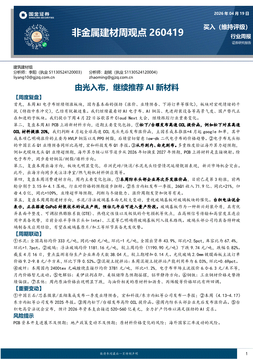 非金属建材行业:国金证券-非金属建材行业周报:由光入布,继续推荐AI新材料-260419