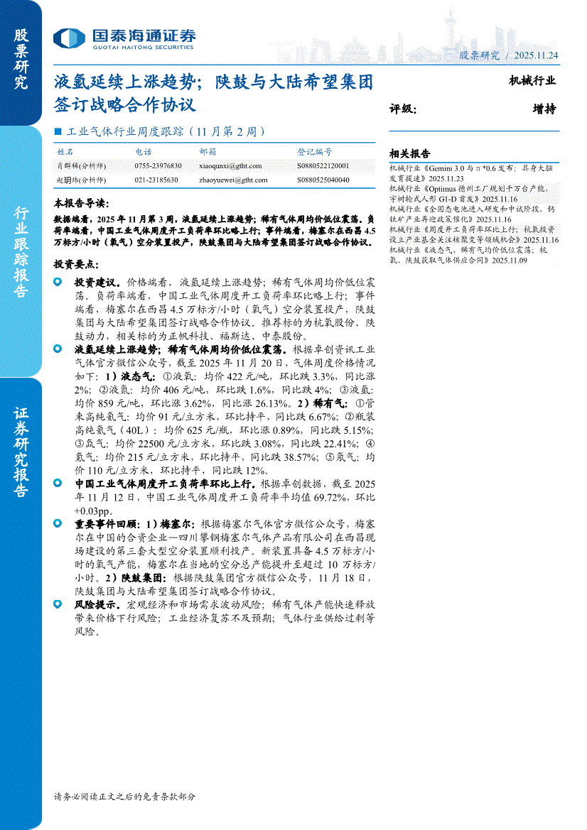 国泰海通证券-机械行业工业气体10月月报:液态气、稀有气均价低位震荡;杭氧、陕鼓获取气体供应合同-251109