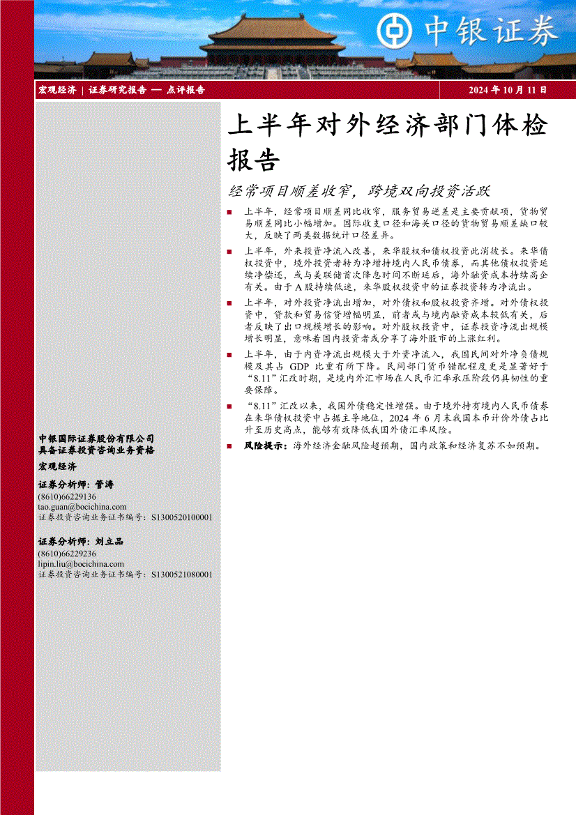 中银国际-上半年对外经济部门体检报告:经常项目顺差收窄,跨境双向投资活跃-241011
