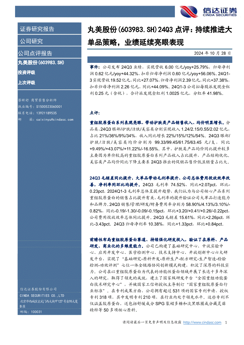 丸美股份:信达证券-丸美股份-603983-24Q3点评:持续推进大单品策略,业绩延续亮眼表现-241028