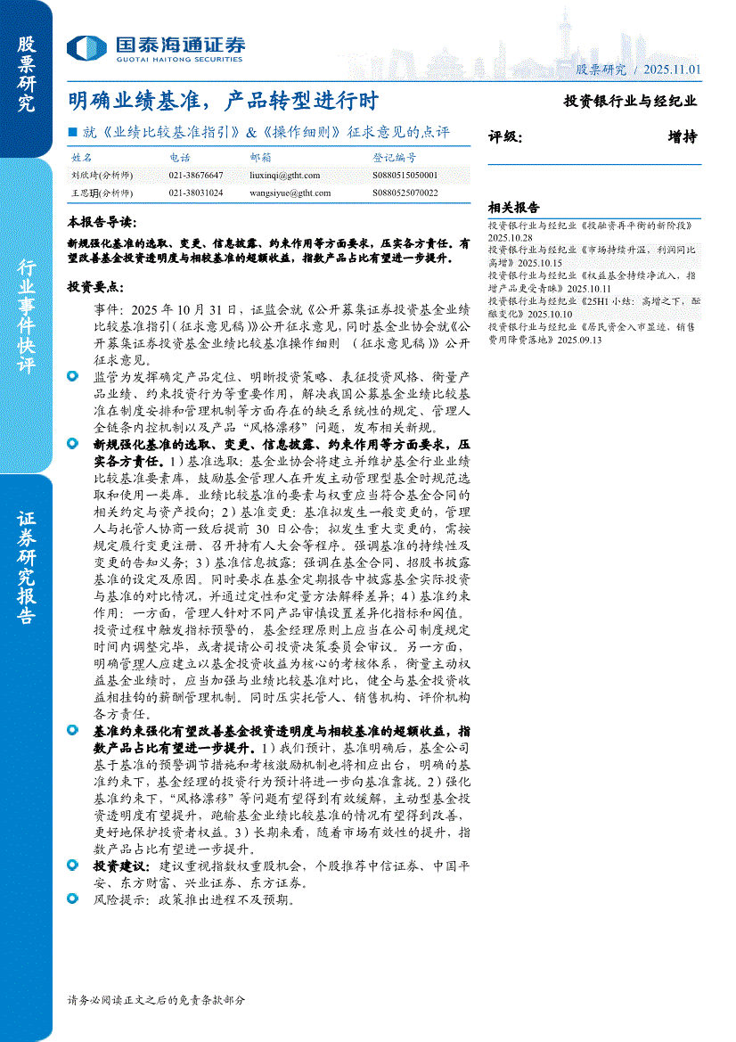 投资银行业与经纪业行业:国泰海通证券-投资银行业与经纪业行业就《业绩比较基准指引》&《操作细则》征求意见的点评:明确业绩基准,产品转型进行时-251101