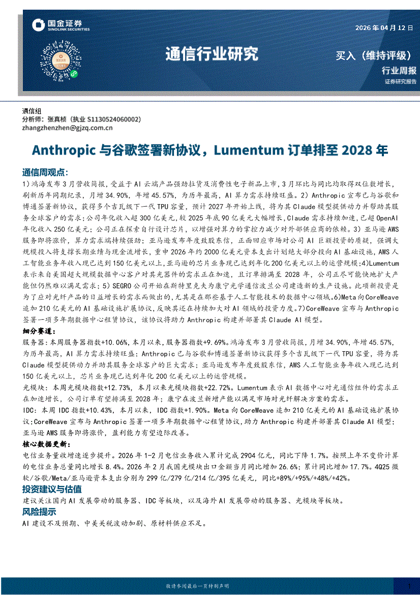 通信行业:国金证券-通信行业周报:Anthropic与谷歌签署新协议,Lumentum订单排至2028年-260412