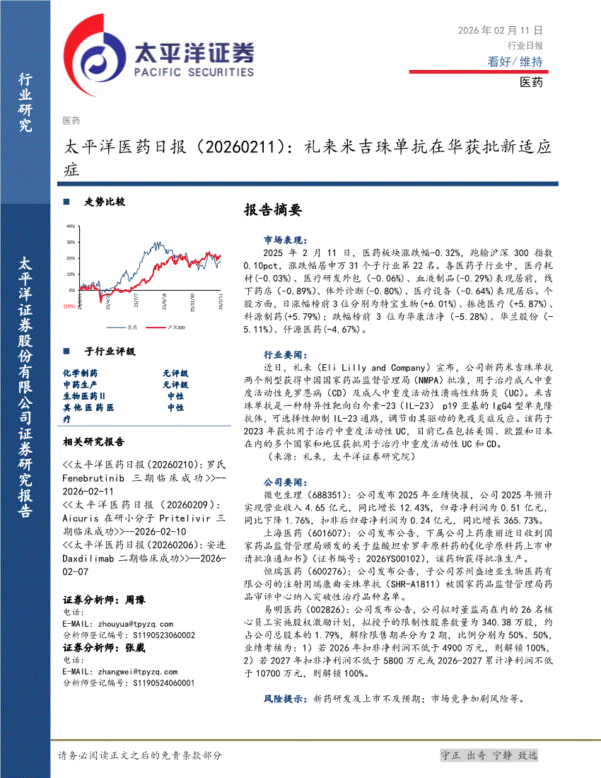 医药行业:太平洋证券-医药行业日报:礼来米吉珠单抗在华获批新适应症-260211