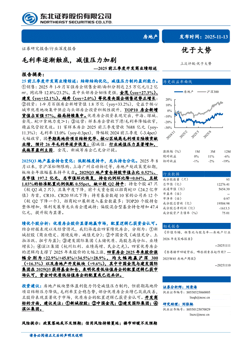 房地产行业:东北证券-房地产行业2025前三季度开发商业绩综述:毛利率逐渐触底,减值压力加剧-251113