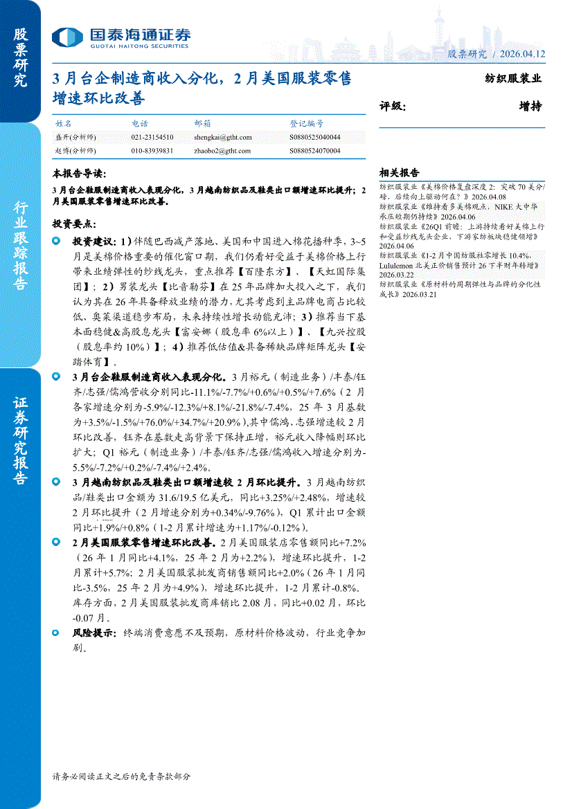 纺织服装行业:国泰海通证券-纺织服装行业跟踪报告:3月台企制造商收入分化,2月美国服装零售增速环比改善-260412