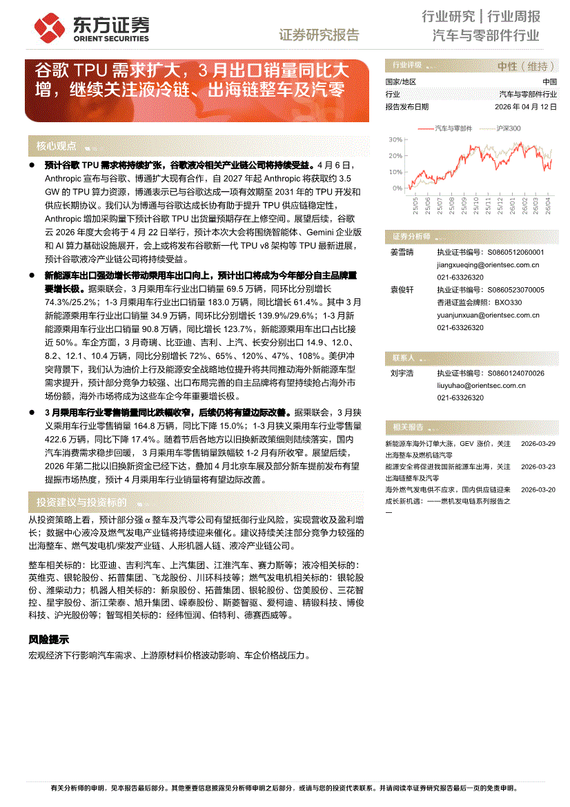 汽车与零部件行业:东方证券-汽车与零部件行业周报:谷歌TPU需求扩大,3月出口销量同比大增,继续关注液冷链、出海链整车及汽零-260412