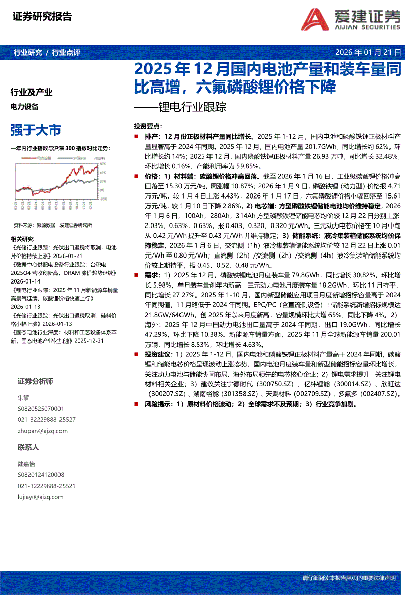 电力设备行业:爱建证券-锂电行业跟踪:2025年12月国内电池产量和装车量同比高增,六氟磷酸锂价格下降-260121