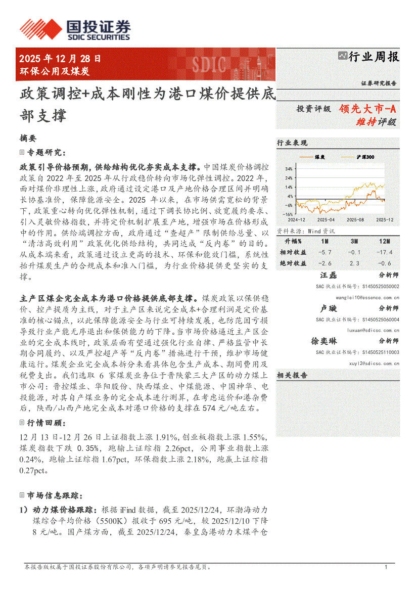 环保公用及煤炭行业:国投证券-环保公用及煤炭行业周报:政策调控+成本刚性为港口煤价提供底部支撑-251228
