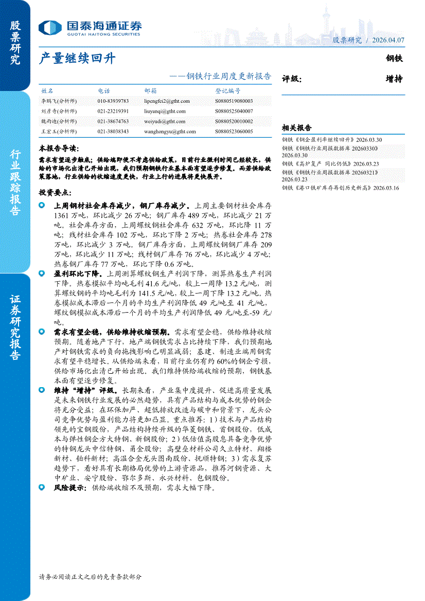 钢铁行业:国泰海通证券-钢铁行业周度更新报告:产量继续回升-260407