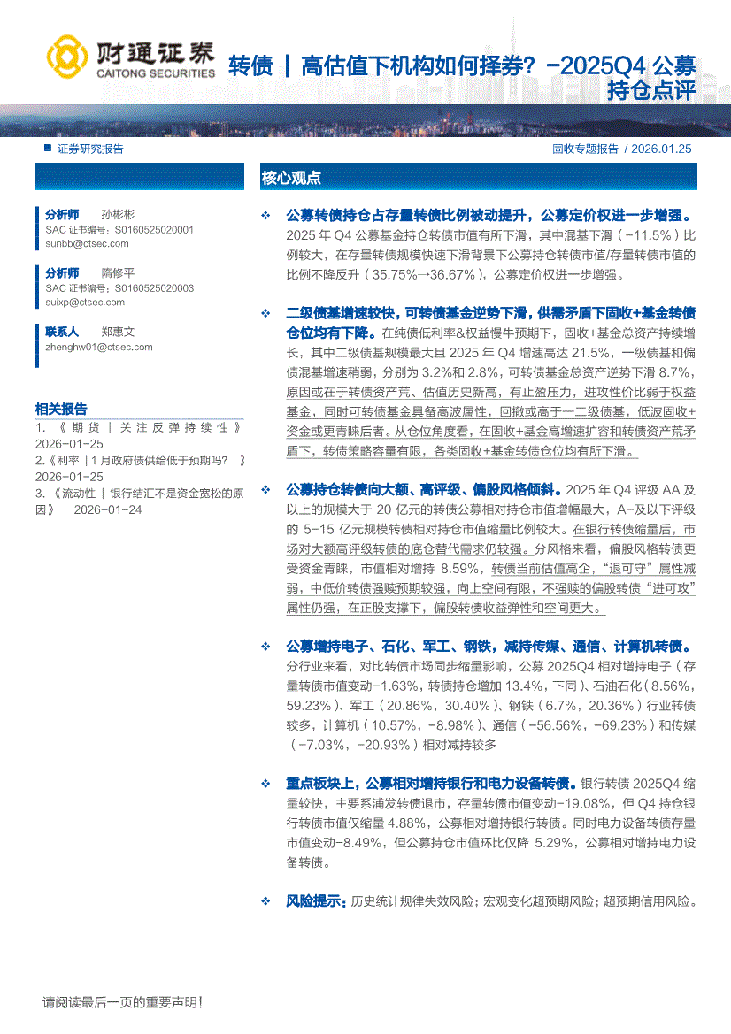 财通证券-2025Q4公募持仓点评:转债|高估值下机构如何择券?-260125