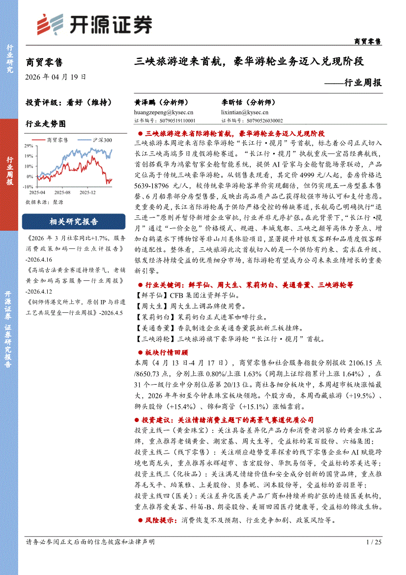 商贸零售行业:开源证券-商贸零售行业周报:三峡旅游迎来首航,豪华游轮业务迈入兑现阶段-260419