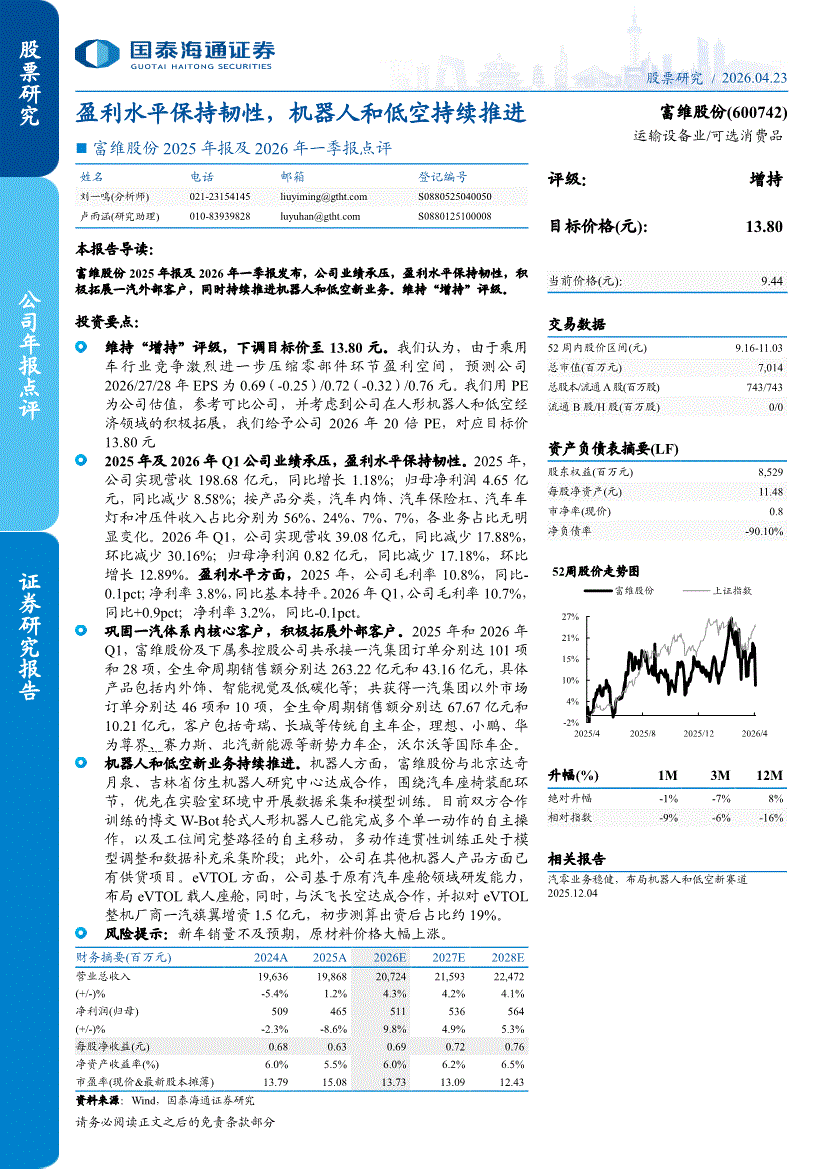 富维股份:国泰海通证券-富维股份-600742-2025年报及2026年一季报点评:盈利水平保持韧性,机器人和低空持续推进-260423