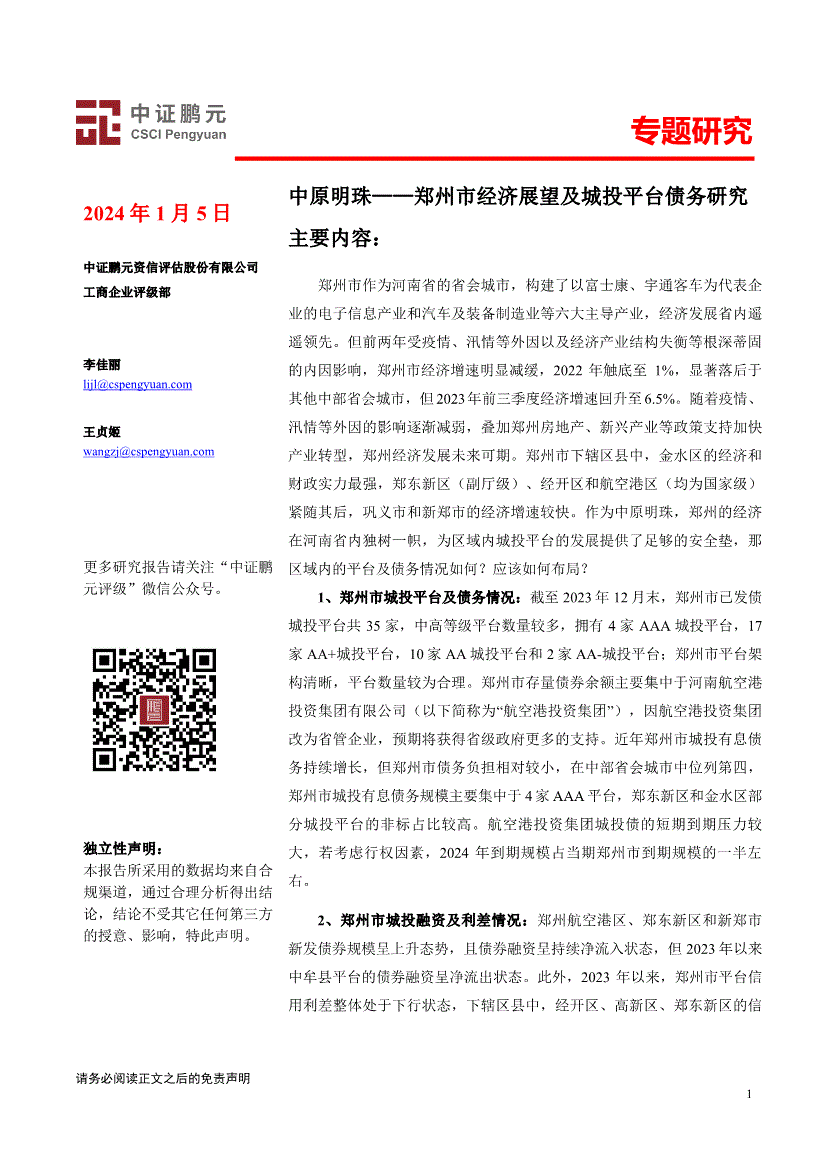 中证鹏元资信评估股份有限公司-郑州市经济展望及城投平台债务研究:中原明珠-240105