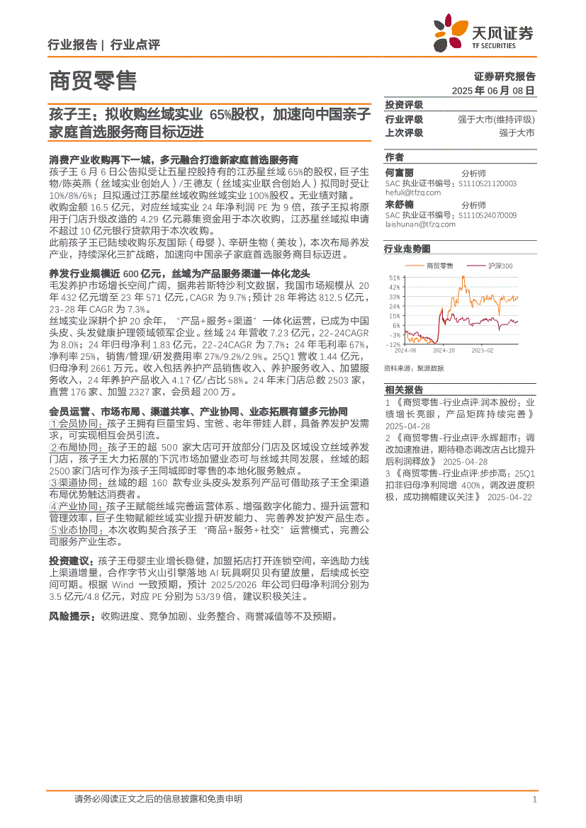 商贸零售行业:天风证券-商贸零售行业点评:孩子王,拟收购丝域实业65%股权,加速向中国亲子家庭首选服务商目标迈进-250608