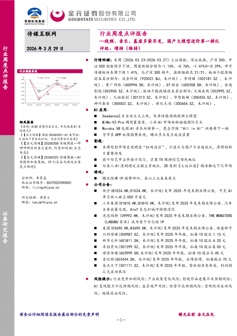 传媒互联网行业:金元证券-传媒互联网行业周度点评报告:视频、音乐、基座多箭齐发,国产大模型进阶第一梯队-260329