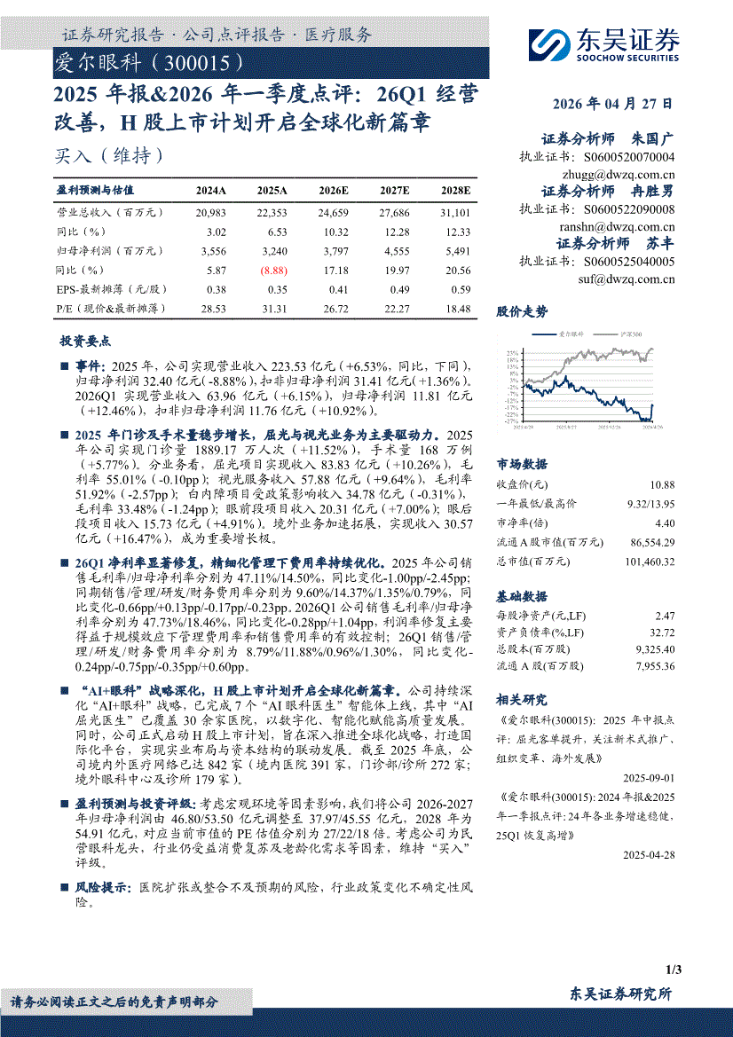 爱尔眼科:东吴证券-爱尔眼科-300015-2025年报&2026年一季度点评:26Q1经营改善,H股上市计划开启全球化新篇章-260427