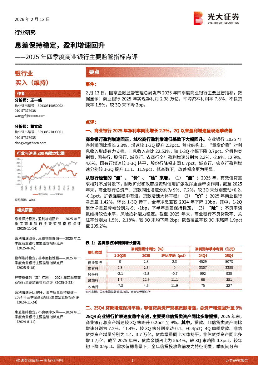 银行业:光大证券-银行业2025年四季度商业银行主要监管指标点评:息差保持稳定,盈利增速回升-260213