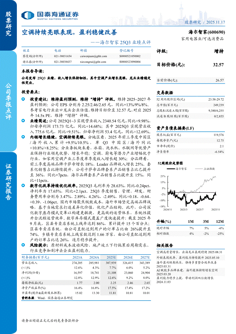 海尔智家:国泰海通证券-海尔智家-600690-25Q3业绩点评:空调持续亮眼表现,盈利稳健改善-251117