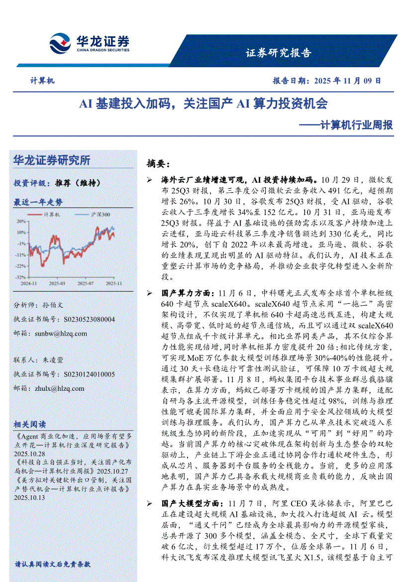 计算机行业:华龙证券-计算机行业周报:AI基建投入加码,关注国产AI算力投资机会-251109