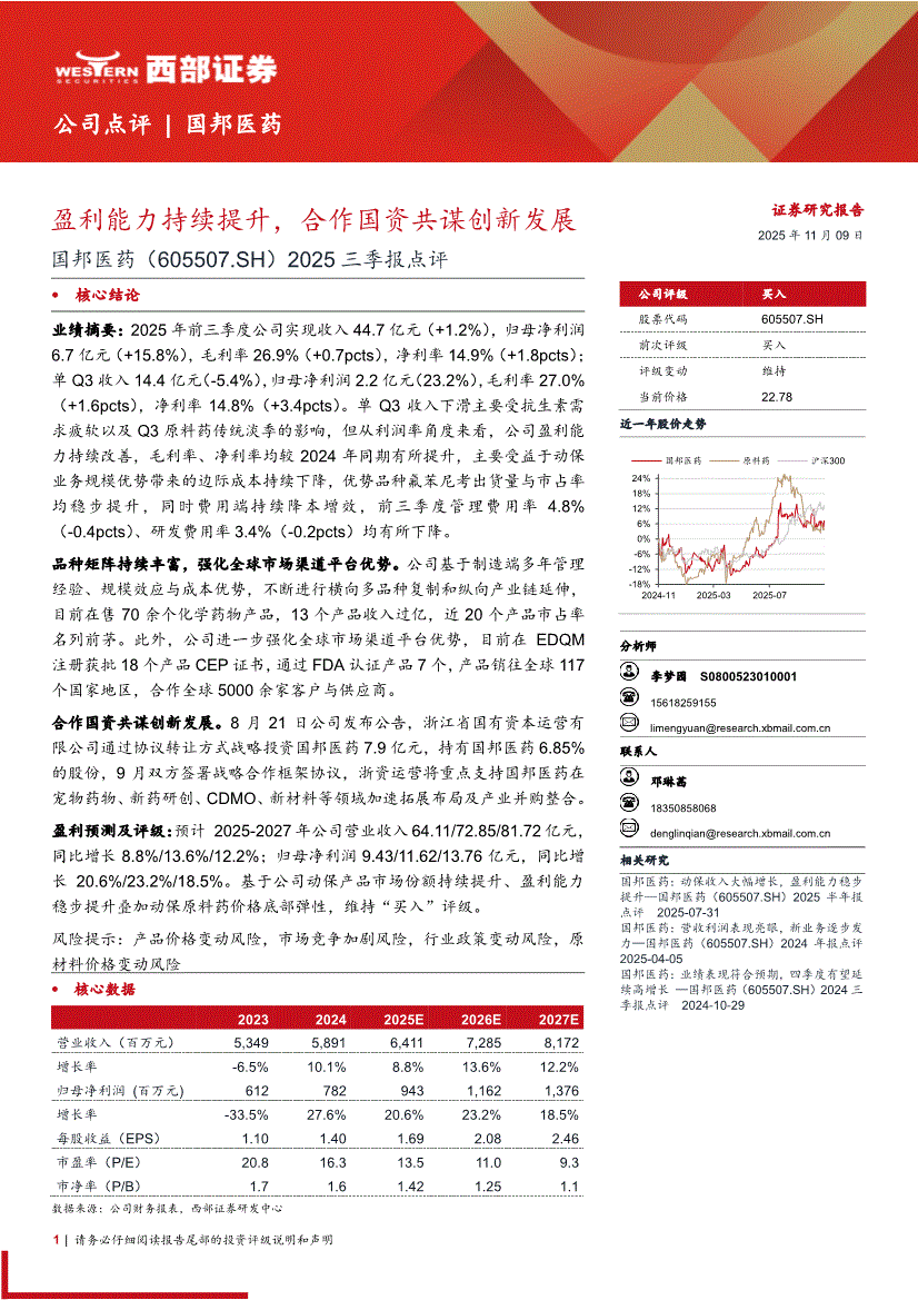 国邦医药:西部证券-国邦医药-605507-2025三季报点评:盈利能力持续提升,合作国资共谋创新发展-251109