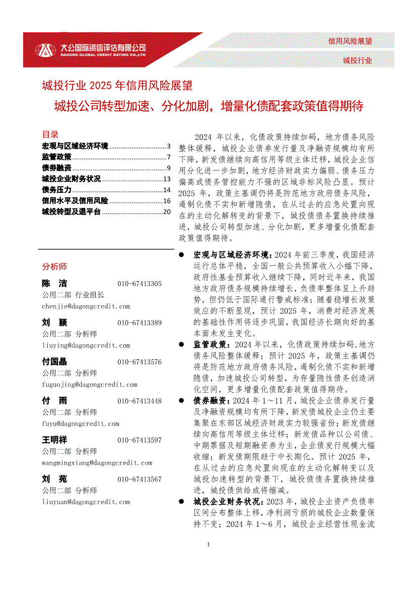 大公国际-城投行业2025年信用风险展望:城投公司转型加速、分化加剧,增量化债配套政策值得期待-250117