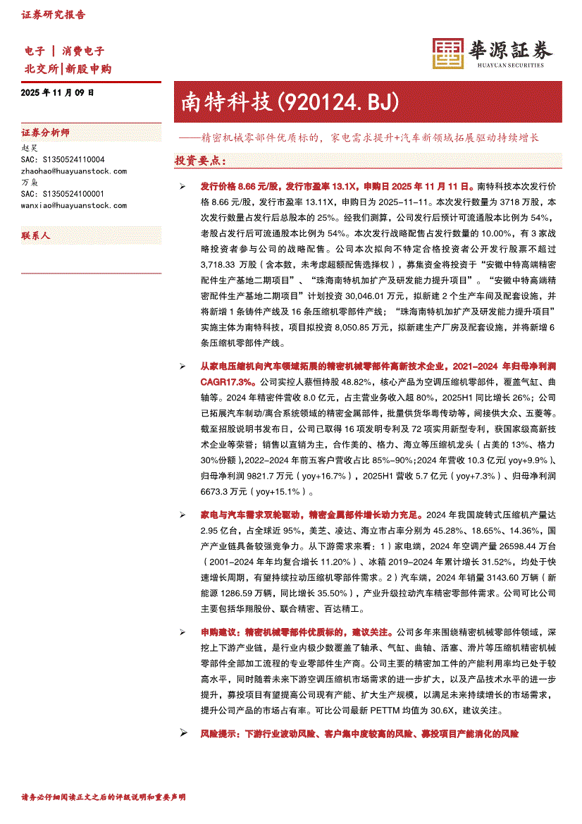 华源证券-南特科技(920124)精密机械零部件优质标的,家电需求提升+汽车新领域拓展驱动持续增长-251109