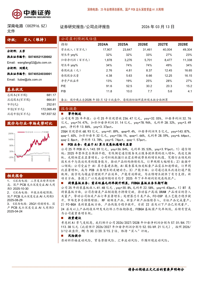 深南电路:中泰证券-深南电路-002916-25年业绩再创新高,国产PCB龙头深度受益AI大周期-260313