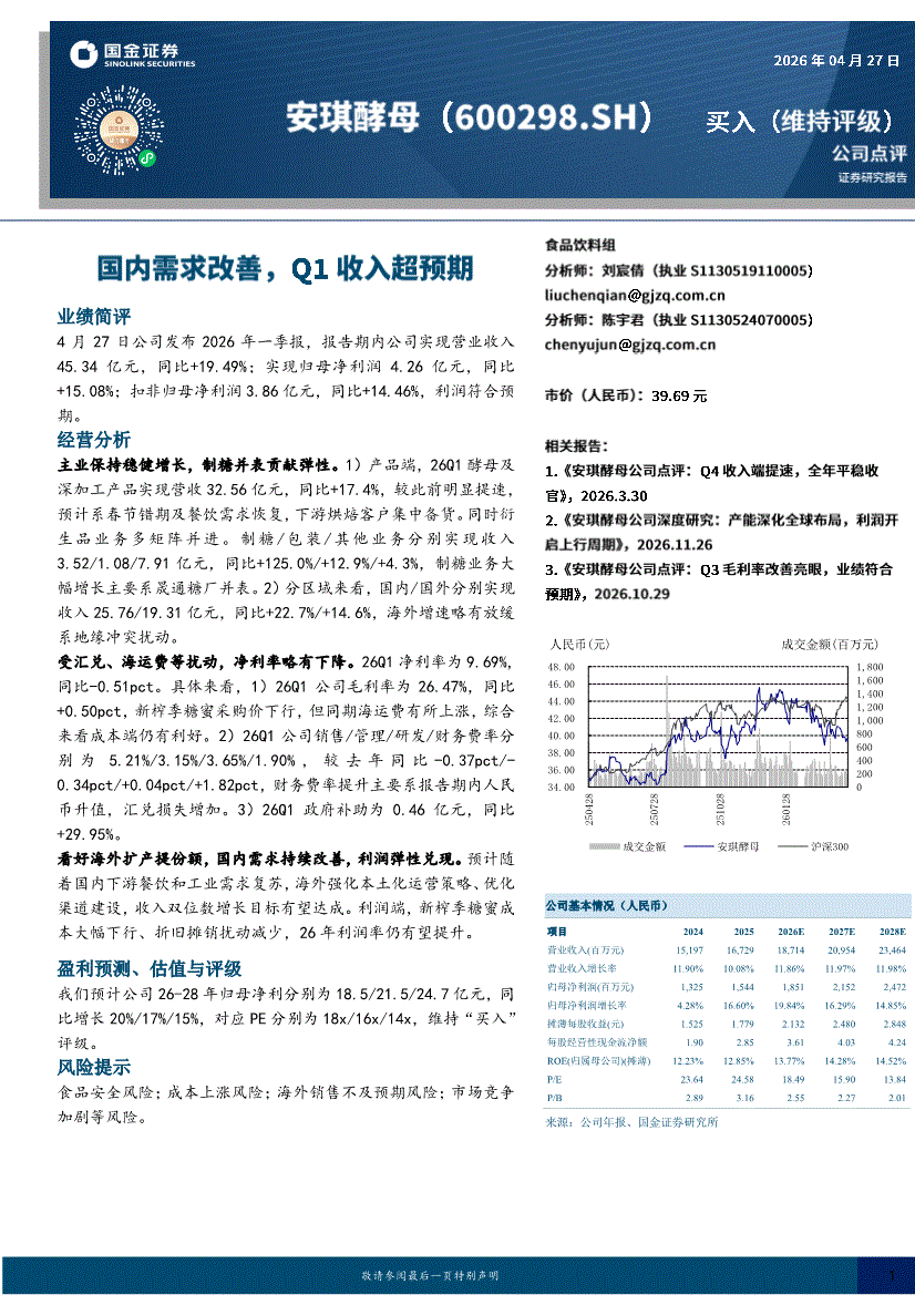 安琪酵母:国金证券-安琪酵母-600298-国内需求改善,Q1收入超预期-260427