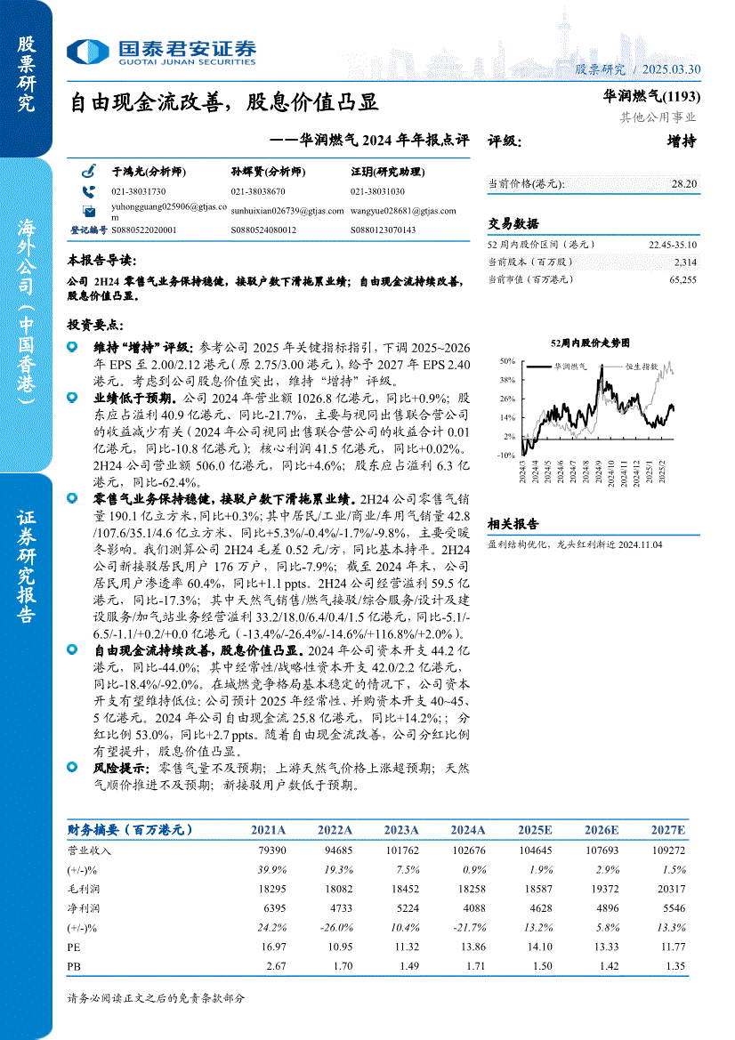 华润燃气:国泰君安-华润燃气-1193.HK-2024年年报点评:自由现金流改善,股息价值凸显-250330
